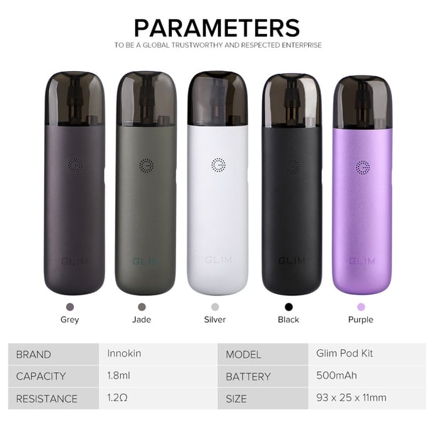 Introducing the Innokin Glim Pod Kit - a compact and satisfying open pod system. Its 1.8ml cartridge is easy to fill and child-resistant. With Glim coils, optimized for longer-lasting flavor, and a 500mAh battery, this kit delivers up to 9W max power. Available in Silver, Black, Grey, Jade, and Purple.